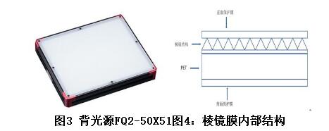 此時的相機相當于人眼,接收到的是直接入射到相機的光強,與亮度表達的概念相符,因此經理論分析亮度是評價此種光源的最佳指標。而其他照明光源例如環光,相機接收到的是照射到被測樣品后的反射光,如圖2。 相機接收到的是照射到樣品上反射的光,與照度表達的概念相符,因此照度是評價除背光外其他光源是最佳的指標。 2.實驗驗證: 為了驗證以上結論,本文分別用亮度和照度來判定背光源中一個輔助配件-棱鏡膜的作用,同時以相機采集到的數據為判定的最終標準。實驗使用的背光源為沃德普的背光源FQ2-50X51,如下圖3:棱鏡膜為3M,該光學膜材內部結構如圖4: