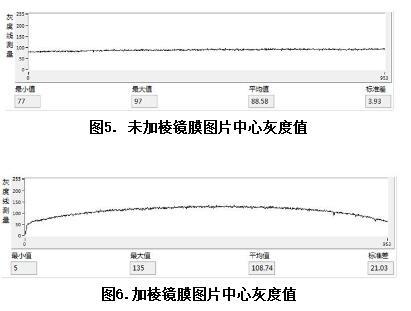 該膜材通過內部微棱鏡結構改變光的發散角度,將光收集到正前方從而達到提高該光源正方向的能量利用率。實驗使用的照度計為柯尼卡美能達CL-200,亮度計為CS-160。相機為東芝CSFS20BC2,鏡頭為computar 2514。分別使用照度計,亮度計測試該背光源不加棱鏡膜和加入棱鏡膜后的照度,亮度并與相機拍攝出來圖片灰度值進行對比。